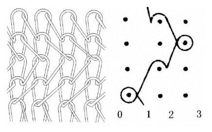 定义:每根经纱顺序地在三枚或三枚以上相邻的织针上垫纱成圈