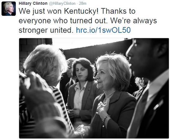 3、希拉里赢得肯塔基州初选,离党内提名更进一步。