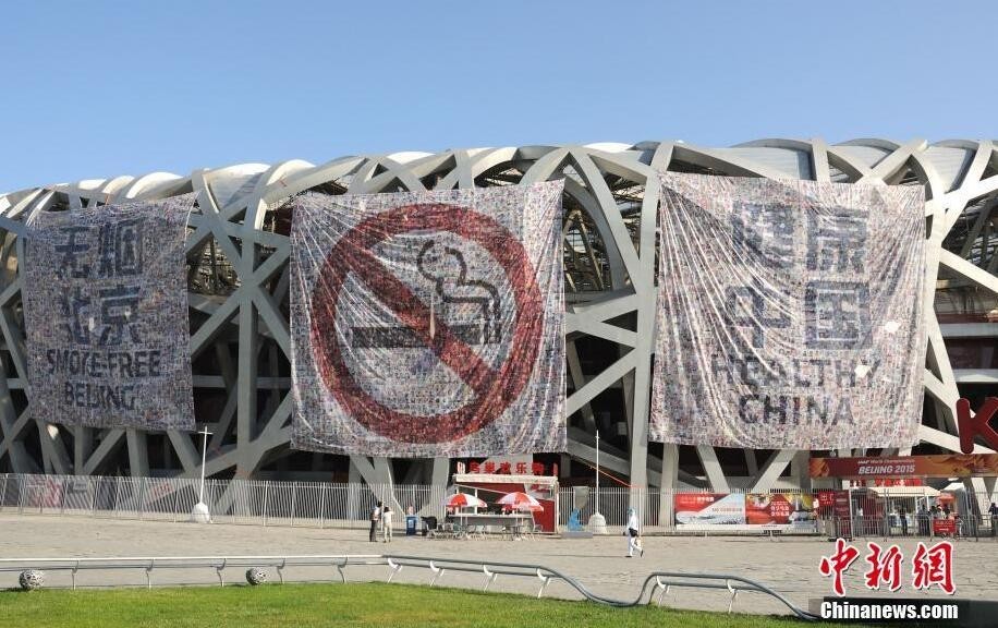2、“鸟巢”悬挂巨幅禁烟标志迎世界无烟日