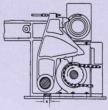 下滚筒(H型滚筒):控制花梳。滚筒上安装16块链块;链块的等级相应于针距的一半;链块的等级通过摆杆1:2放大